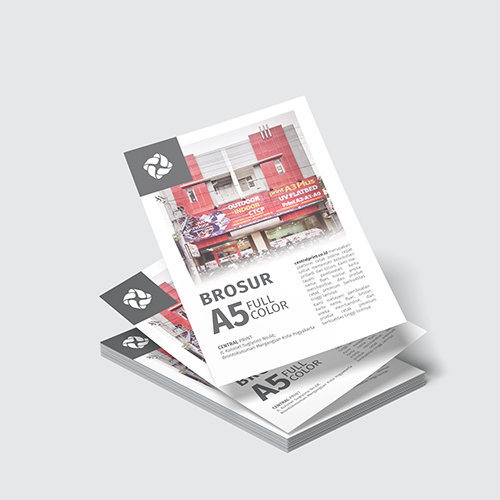 Brosur A5, media promosi yang efektif untuk bisnis atau acara, Ukuran ringkas dan mudah dibawa, Kualitas cetak terbaik dengan warna yang tajam dan jelas, Tersedia berbagai pilihan bahan dan finishing untuk tampilan yang profesional, Cocok untuk menyebarkan informasi produk, layanan, atau event, Harga tertera adalah per paket (misalnya, per 100 lembar) dengan ukuran 15 cm x 21 cm